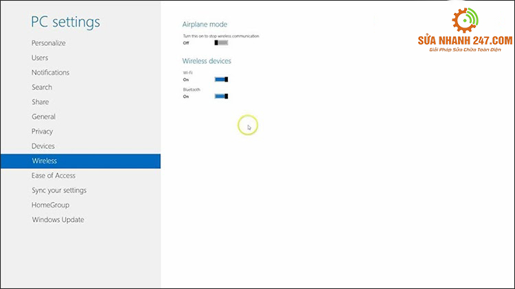 Bước 2: Click Change PC setting → Chọn Wireless → Bật biểu tượng Bluetooth.