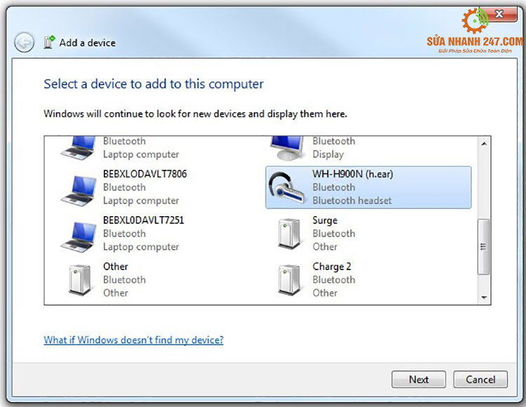 Bước 2: Tại giao diện Windows sẽ hiển thị danh sách những thiết bị có thể nhận dạng, bạn chọn đúng tên muốn kết nối và bấm Next. Khi hoàn tất, Windows sẽ thông báo thành công.