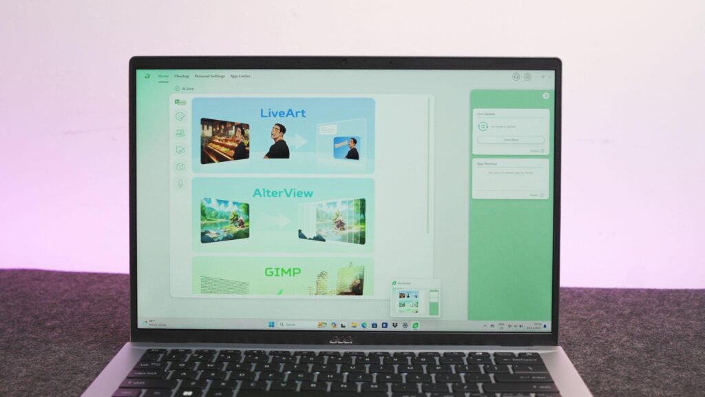 Máy có sẵn các AI hỗ trợ người dùng như LivArt giúp tách nền hình ảnh, AlterView để tạo hình động 3D hay GIMP tạo hình ảnh thông qua câu lệnh… Các tính năng AI trên Acer Swift Go 14 AI rất đa dạng, gần như hỗ trợ xử lý mọi tác vụ công việc cần có của một chiếc Laptop.
