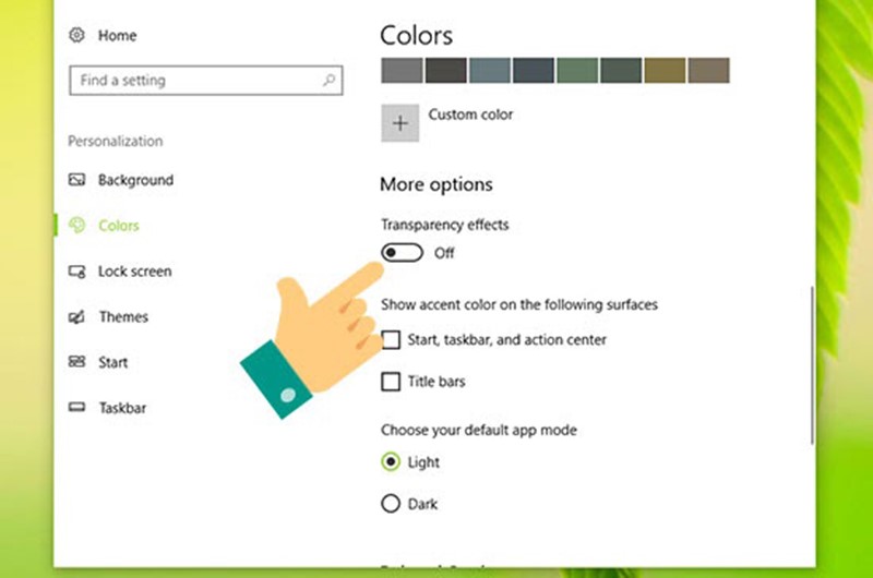 Bước 2: Bây giờ ở mục color tắt hết tùy chọn Transparency effects, bỏ tích 2 ô Start, taskbar, and action center và Title bars.