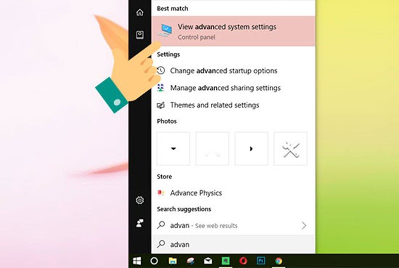 Bước 1: Bạn nhấn phím Windows và nhập Advanced để mở Advanced system settings như hình dưới.