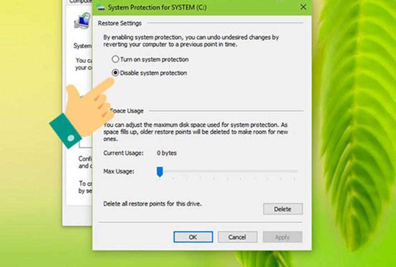 Chọn Disable system protection để tắt System Restore